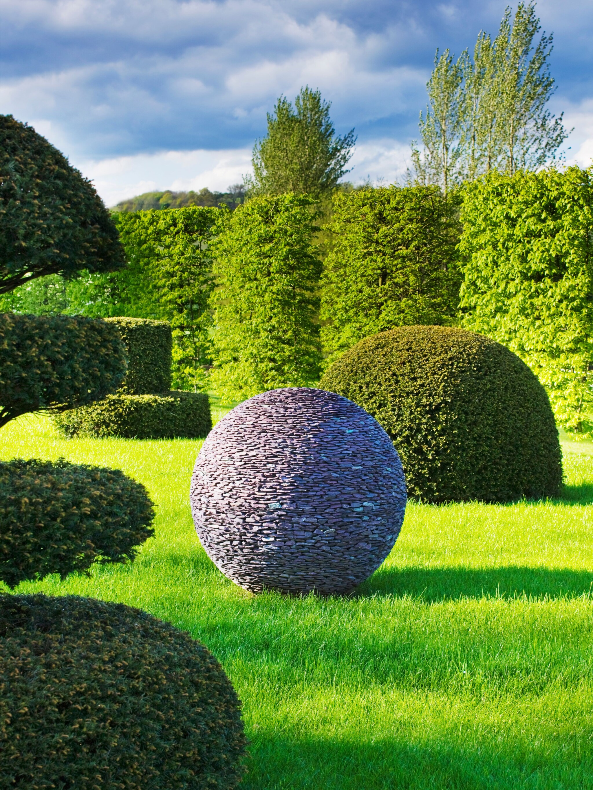 The natural character of slate allows it to be positioned in many outdoor sites. It can be used as a charming focal point at the end of a pathway or as outdoor art within wild, naturalistic planting. Our Dark Planet fountain sphere sculpture makes for an alluring centerpiece for a pond or pool – even more so when raised onto a pedestal. The water cascades down the face, changing the gray color of the slate to deep purple.